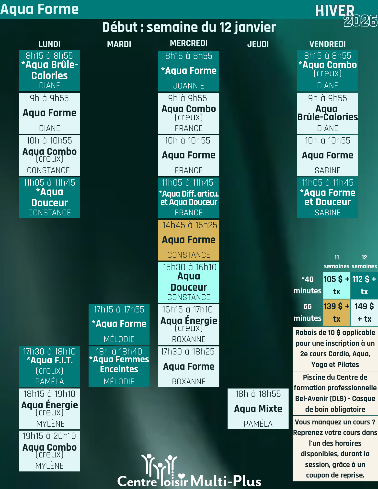 Entraînement complet, sur musique, avec différents objets. Période d'échauffement, exercices cardiovasculaires (aérobie), exercices musculaires et relaxation. Améliore votre forme physique. Adapté à la clientèle en bonne condition physique. Aqua Forme à rythme accéléré pour les 15 ans et plus. |
