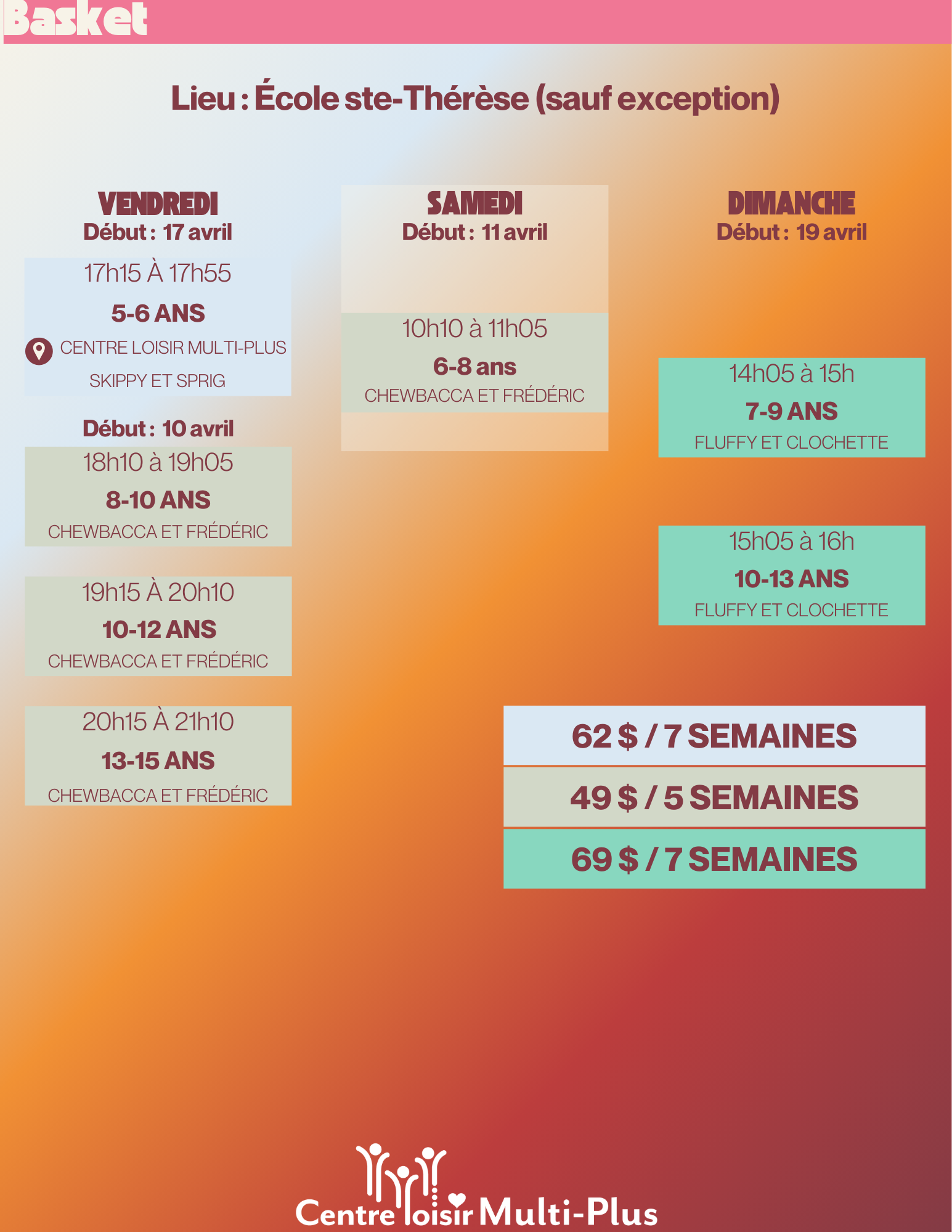 Activité récréative où le jeune aura l'occasion d'apprendre et pratiquer des techniques de basketball par le biais de jeux et de parties amicales.