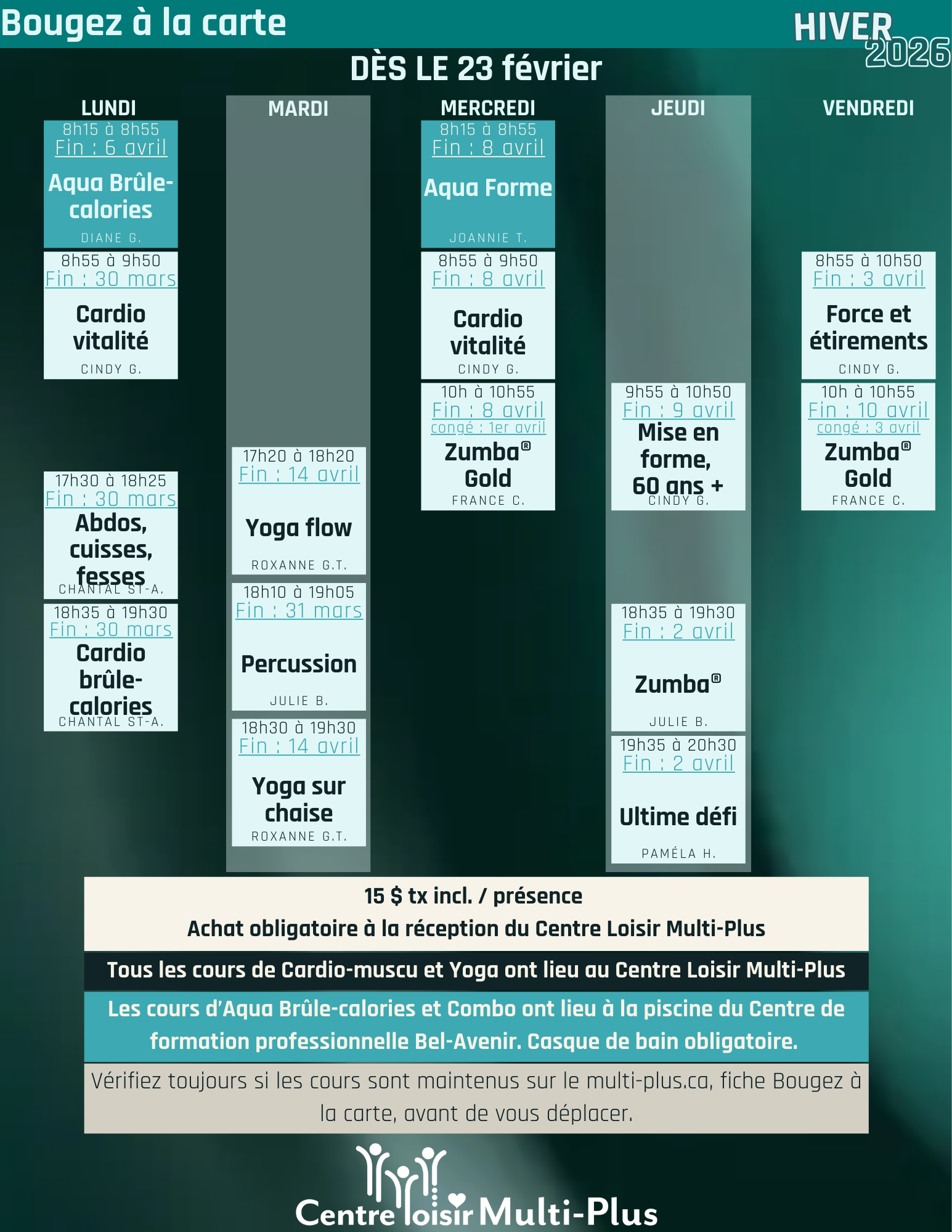 | Aqua Brûle-calories | 6 avril | Entraînement complet, sur musique avec différents objets. Période d'échauffement, exercices cardiovasculaires (aérobie), exercices musculaires et relaxation. Améliore votre forme physique. Adapté à la clientèle en bonne condition physique. Aqua Forme à rythme accéléré pour les 15 ans et plus. | Serviette, bouteille d'eau et casque de bain (obligatoire) | |