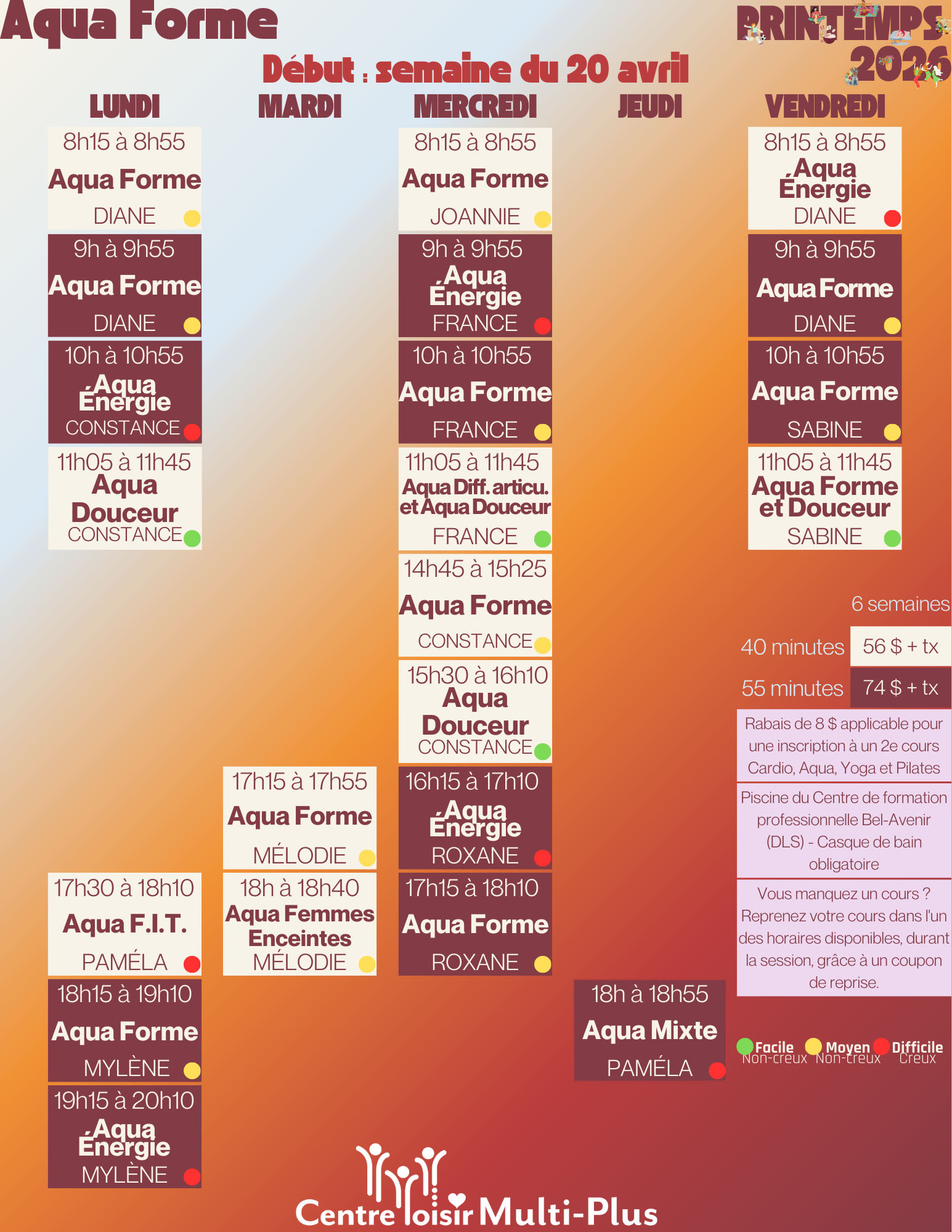 - Vous aurez accès à la piscine 5 minutes avant le début.