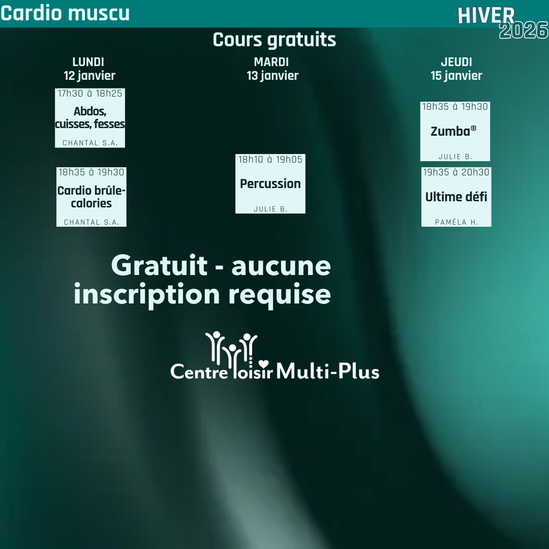 Cours d'entraînement varié et motivant ! Un mélange énergique de cardio step, boxe, tabata, pump, abdos-fesses-cuisses et plus encore — tout en une seule session! Idéal pour finir la semaine en force (ou bouger après un 5 à 7 pas trop arrosé!) |