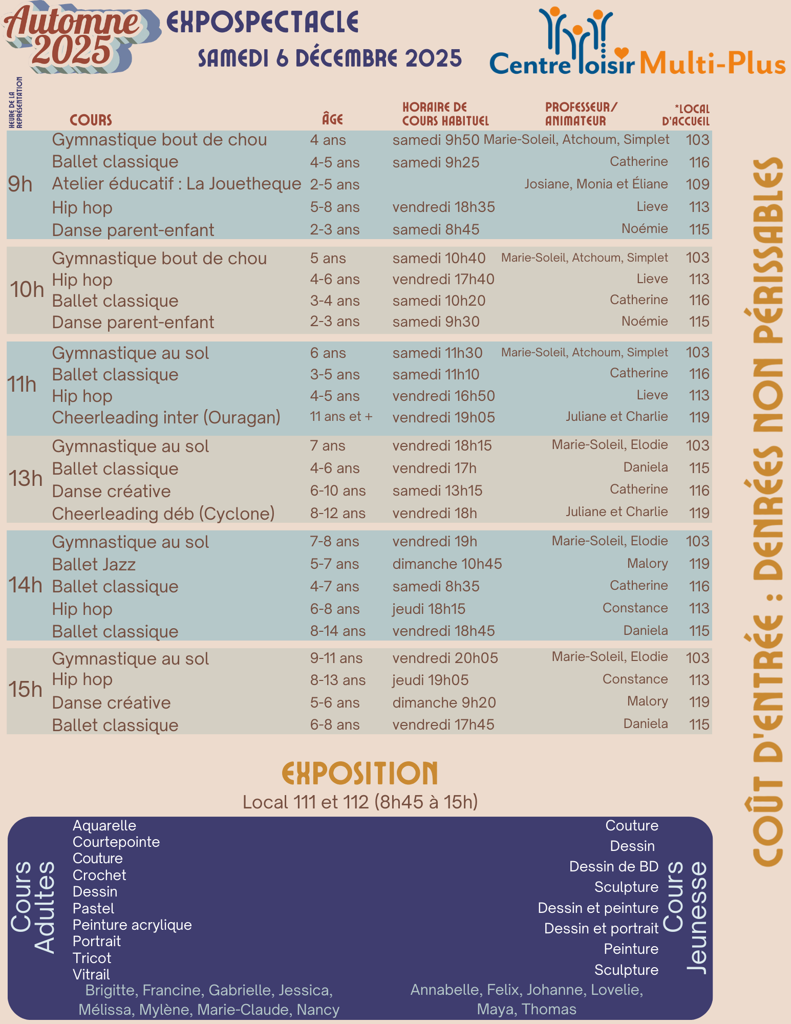 Pour clôturer la session, une journée ExpoSpectacle (spectacles et expositions) sera organisée le samedi 6 décembre. Tous les enfants, avec leur professeur, y participeront pour présenter leurs réalisations.