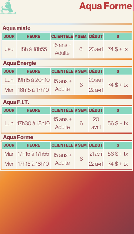 Entraînement complet, en eau peu profonde, sur musique, avec différents objets. Période d'échauffement, exercices cardiovasculaires (aérobie), exercices musculaires et relaxation. Améliore votre forme physique. Adapté à la clientèle débutante et avancée. En eau peu profonde. |