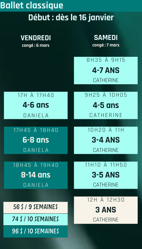 Plusieurs horaires de cours en fonction de l'âge de l'enfant.